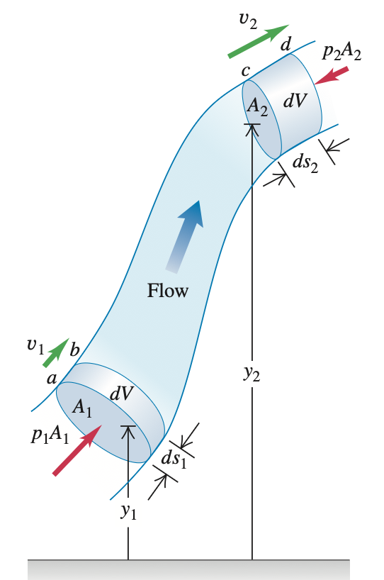 P₁dV − P₂dV = ½ρdV(v₂² − v₁²) + ρdVg(y₂ − y₁)