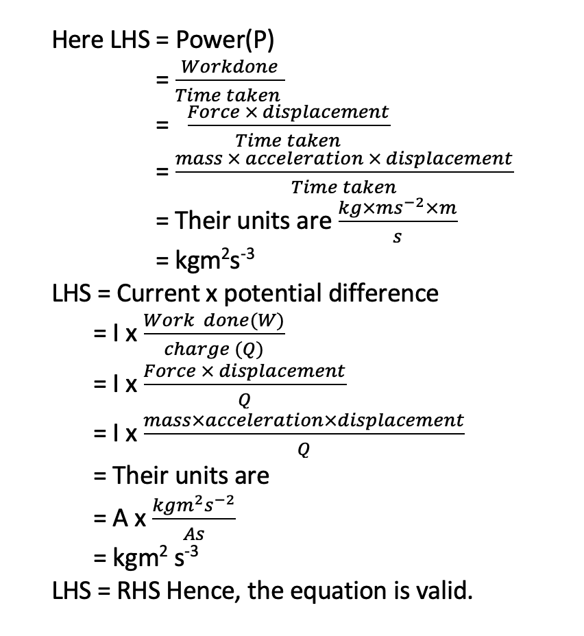 3. Use fundamental units to show that equation P = IV is homogeneous, where I is electric current, V is voltage and P is power.