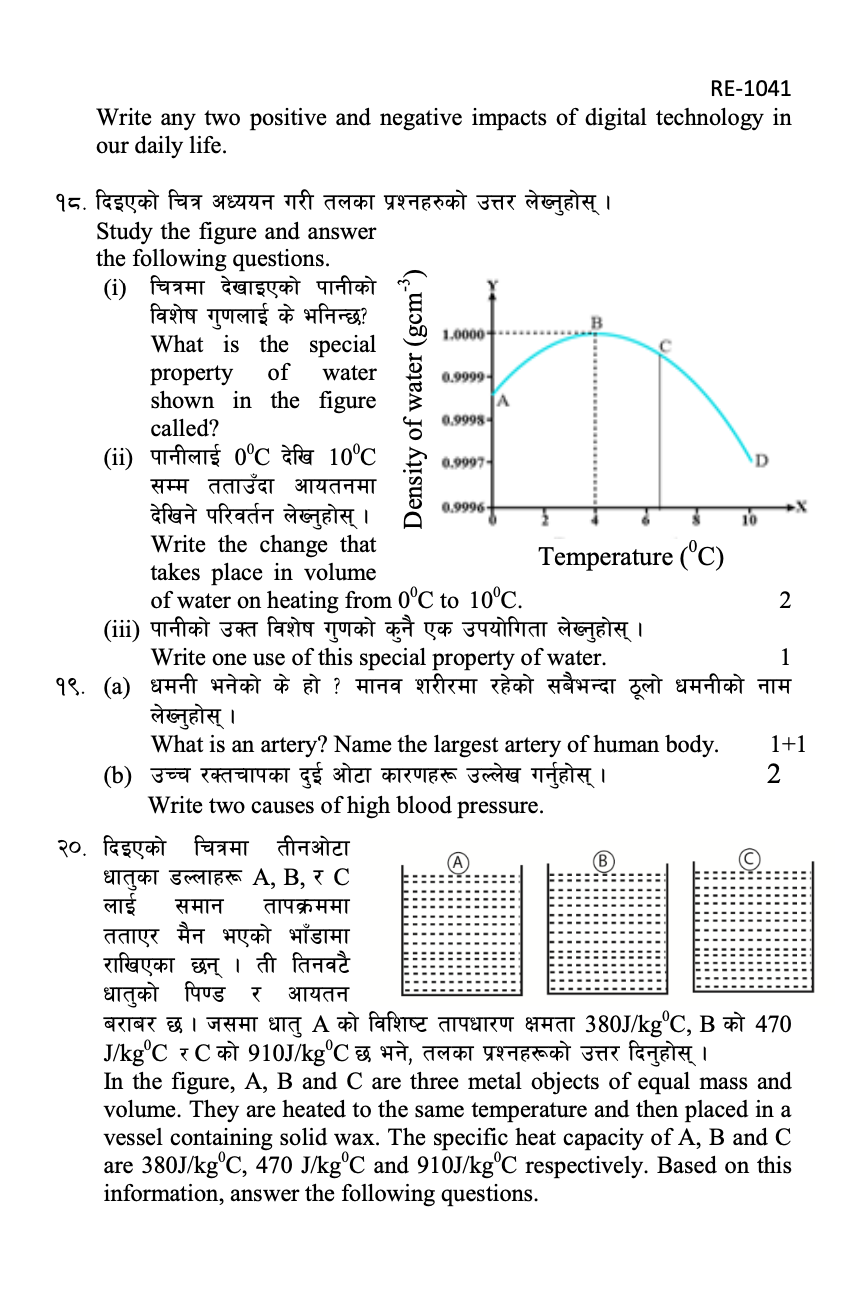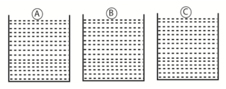 20) In the figure, A, B and C are three metal objects of equal mass and volume. They are heated to the same temperature and then placed in a vessel containing solid wax. The specific heat capacity of A, B and C are 380J/kg0C, 470 J/ kg0C and 910J/ kg0C respectively. Based on this information, answer the following questions.