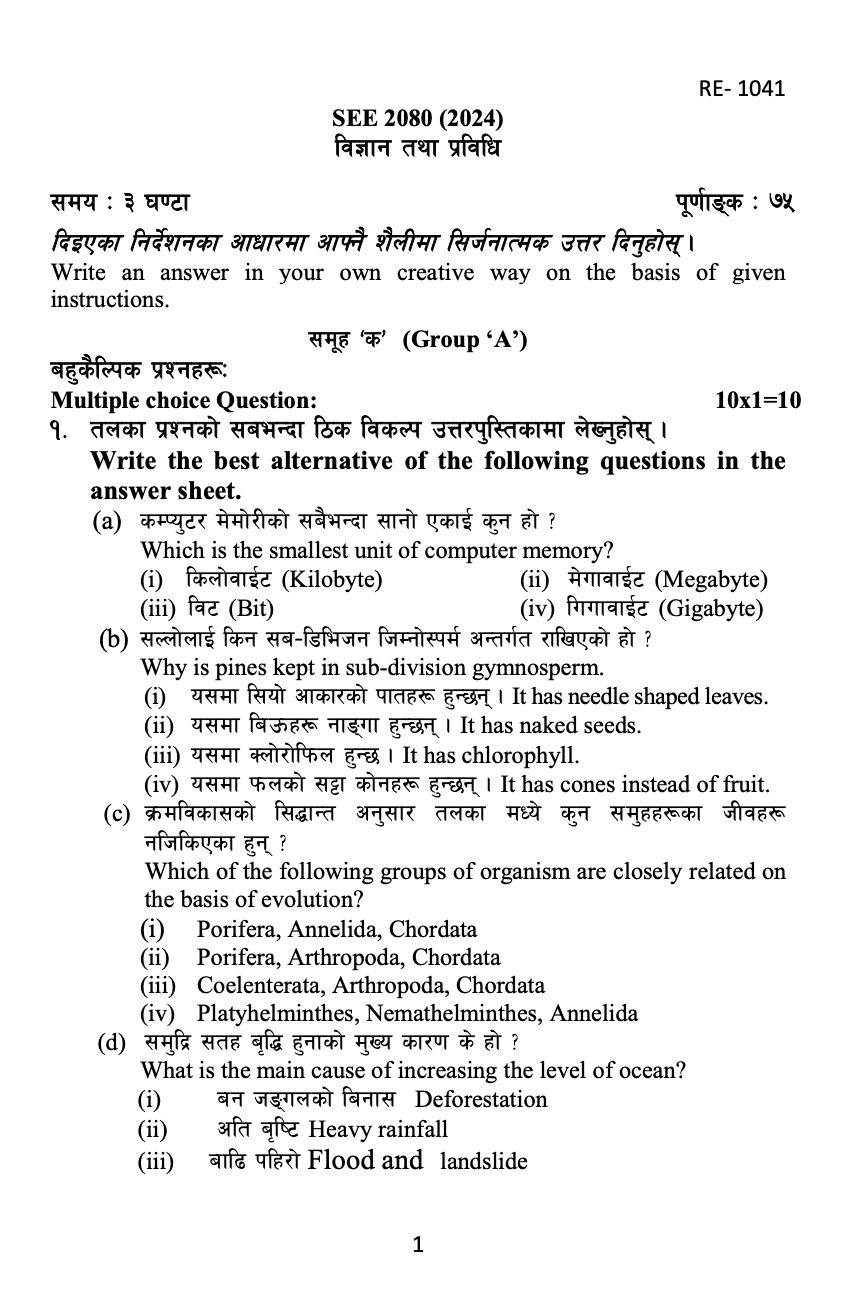 1. Write the correct alternative of the following questions in the answer sheet.