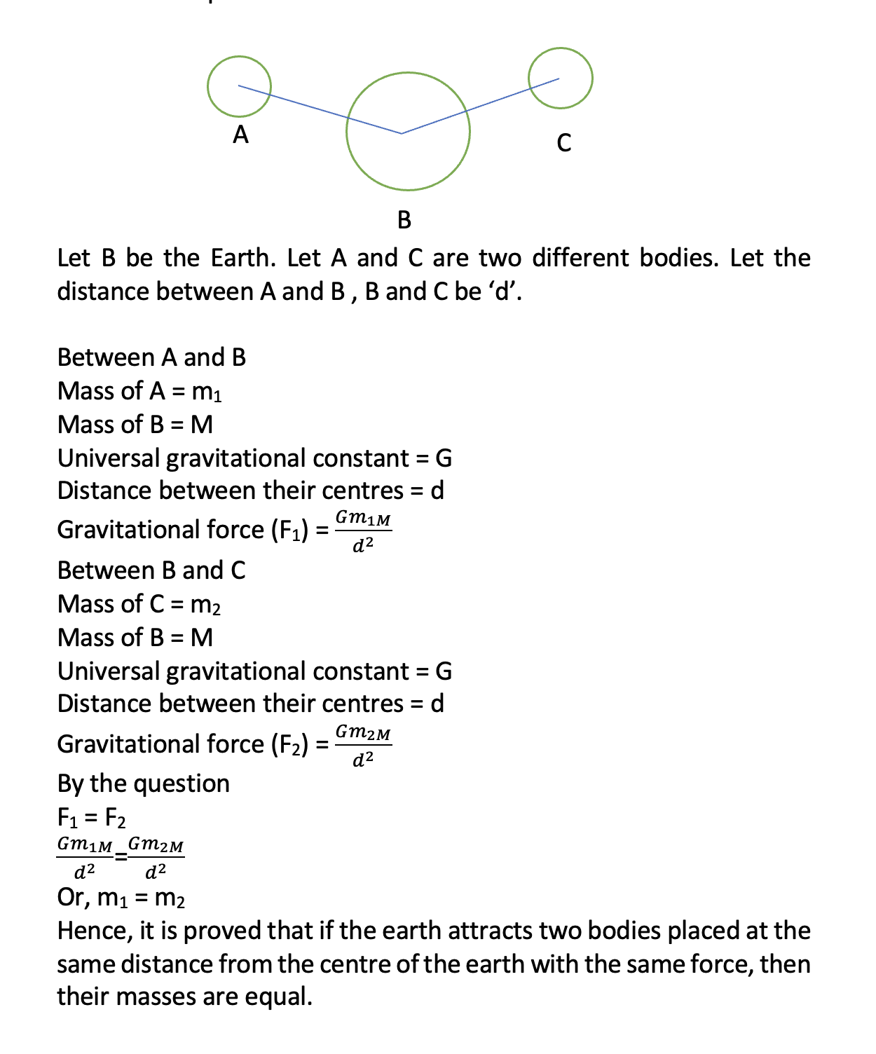 11. Prove that if the earth attracts two bodies placed at the same distance from the centre of the earth with the same force, then their masses are equal.