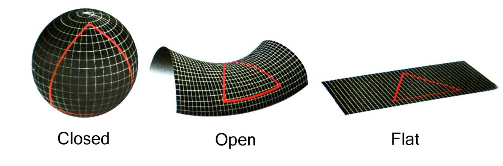 The universe has a spherical shape. Parallel lines converge, and the angles of a triangle add up to more than 180°.